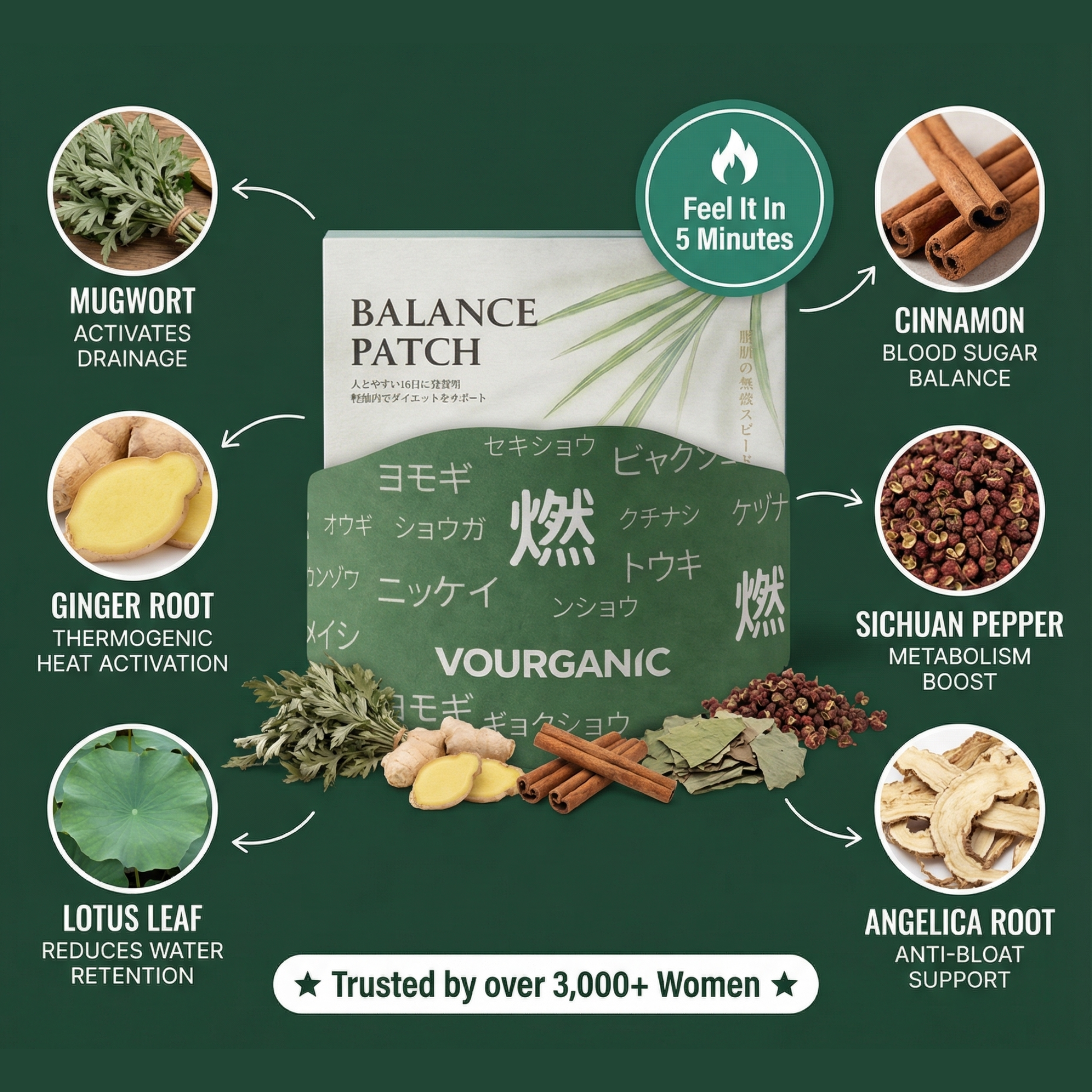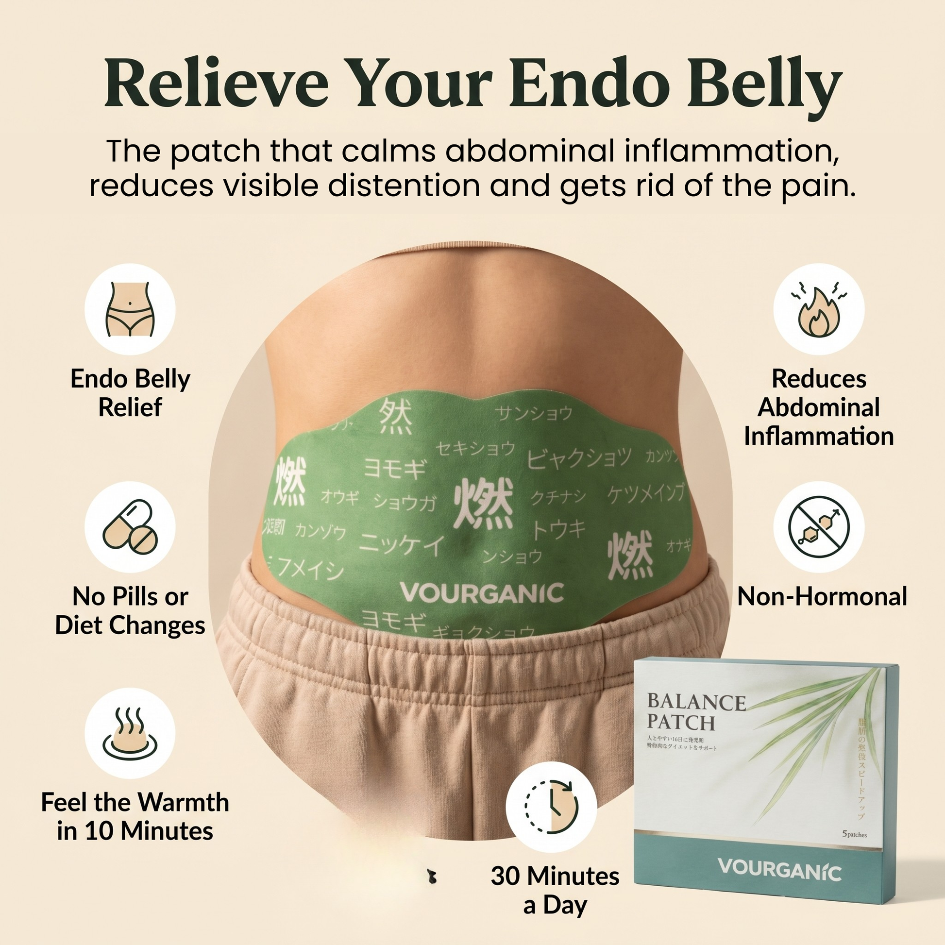 Place the patch on your belly button and within 10 minutes you feel warmth. The botanicals are absorbing through the skin and flushing out the inflammation.